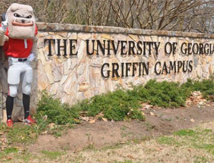 Mascot "Hairy Dawg" standing beside a stone wall that read "The University of Georgia Griffin Campus"
