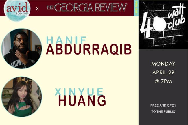 Join The Georgia Review and Avid Bookshop at the legendary 40 Watt for a literary night you won't want to miss. Best-selling writer and music critic Hanif Abdurraqib reads from his newly released book, There's Always This Year, about basketball, life, and home. Emerging bilingual poet Xinyue Huang reads from her book on love, loss, and persistence. Free and open to the public. Book sale and signing to follow. RSVPs highly suggested.