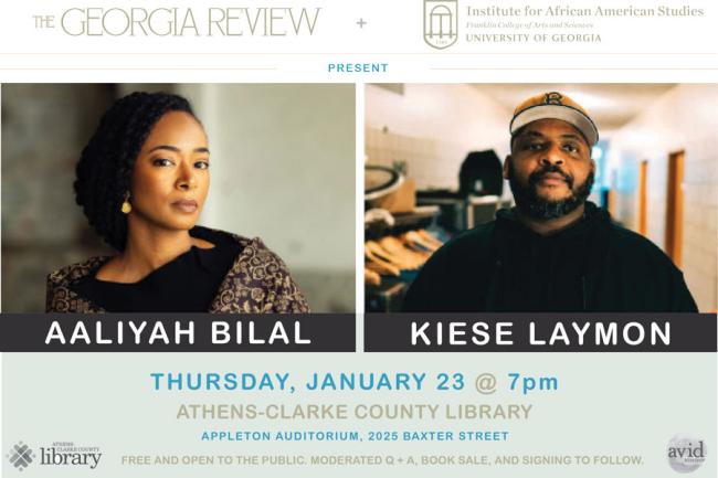 The Georgia Review, the Institute for African American Studies at UGA, Avid Bookshop, and the Athens-Clarke County Library invite the public to a reading with Aaliyah Bilal and Kiese Laymon. This event is on Thursday, January 23, 2025, at 7pm in the Appleton Auditorium at the Athens-Clarke County Library.