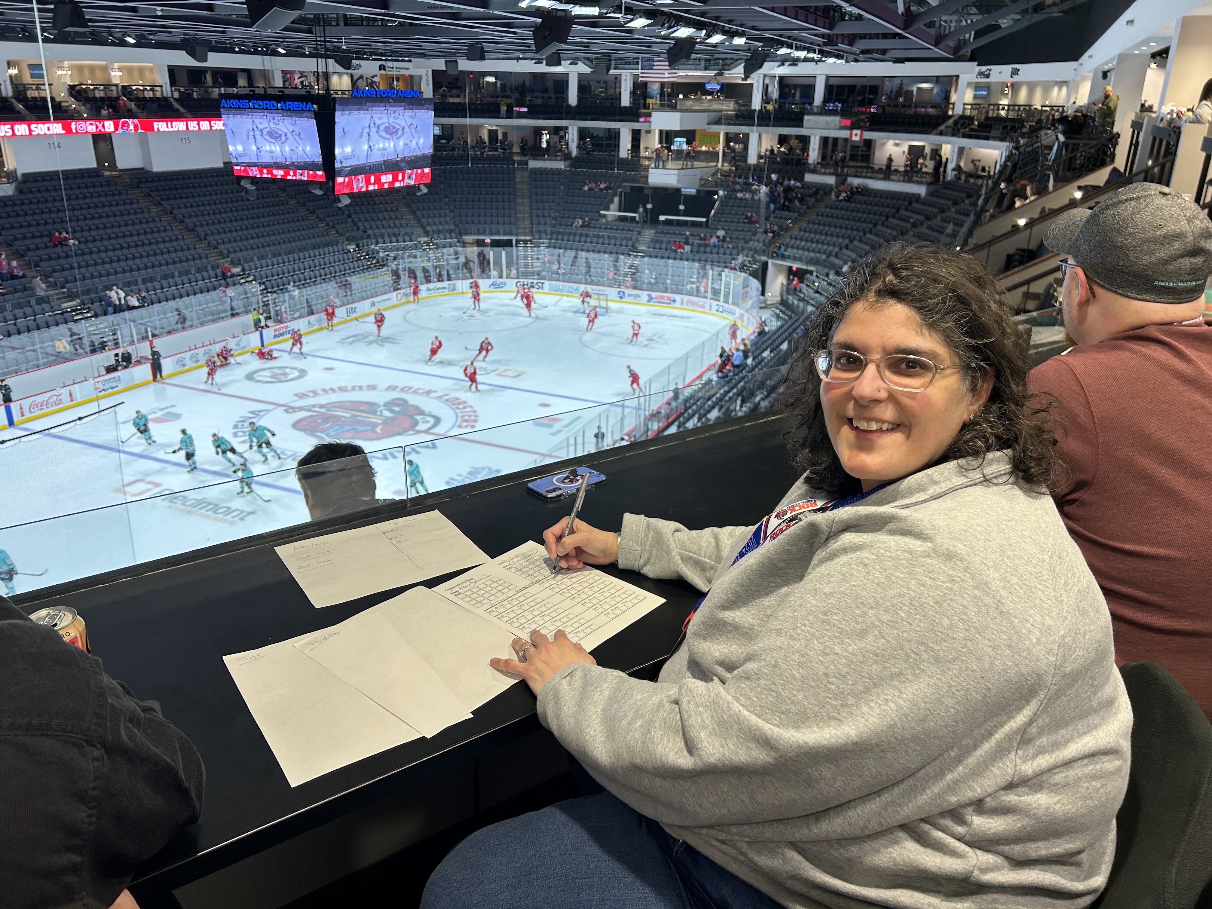 I work with the off-ice team doing game statistics. We have crew on the ice level in the scorekeeper's bench running the timeclock and communications, working the penalty boxes and goal lights, and we have statistics staff (including me) upstairs in the Arena Press Box keeping track of the starting lineups, line changes, plus/minus, goals/assists and penalties — we even have to keep track of the start/end times, nightly attendance numbers, and the "3 stars" of the game. All the game data we report is updated in real time throughout the game on our data system and on the FPHL (Federal Prospects Hockey League) website. At the end of the night, we also get the final game reports signed by both coaches and the referees for final submission to the FPHL league office.